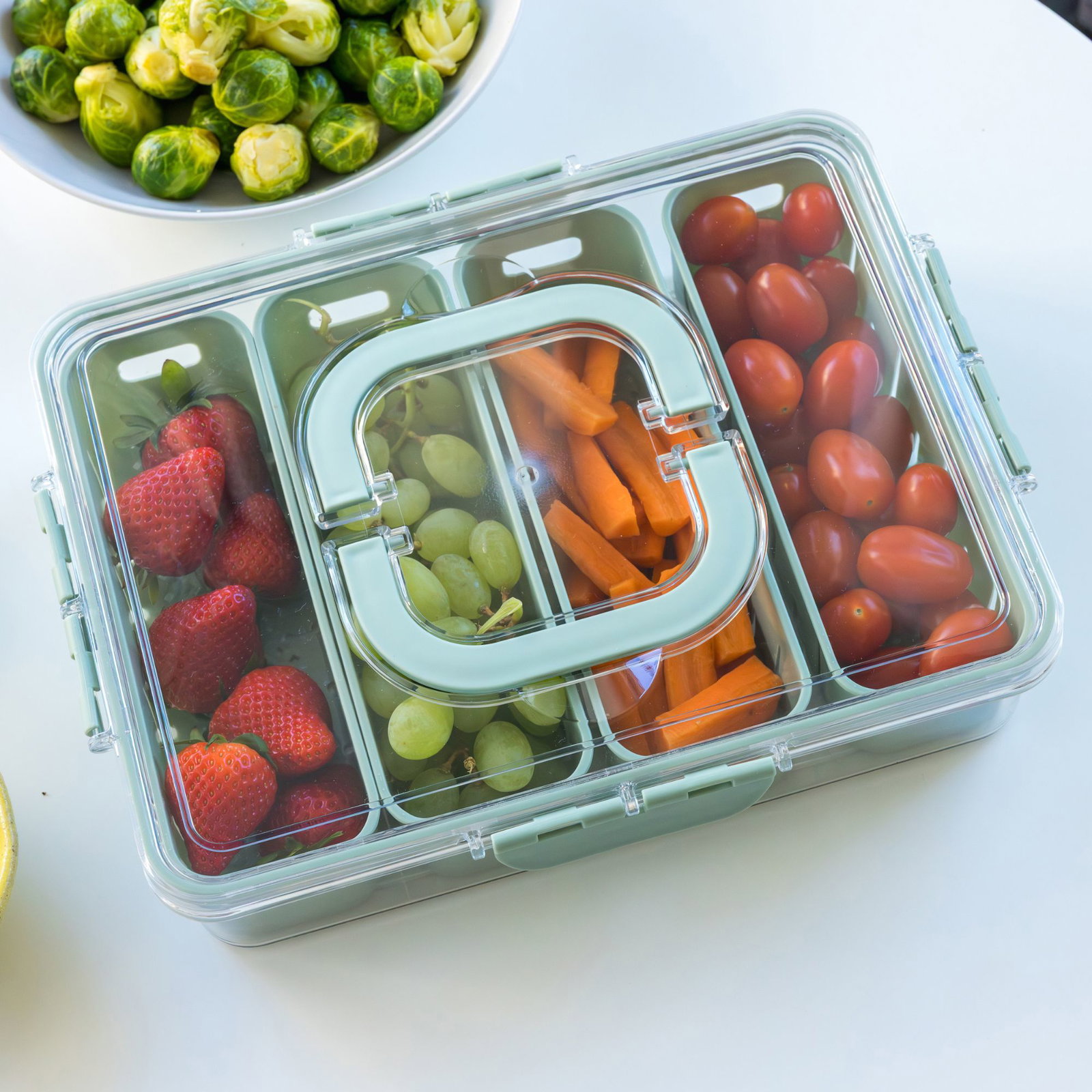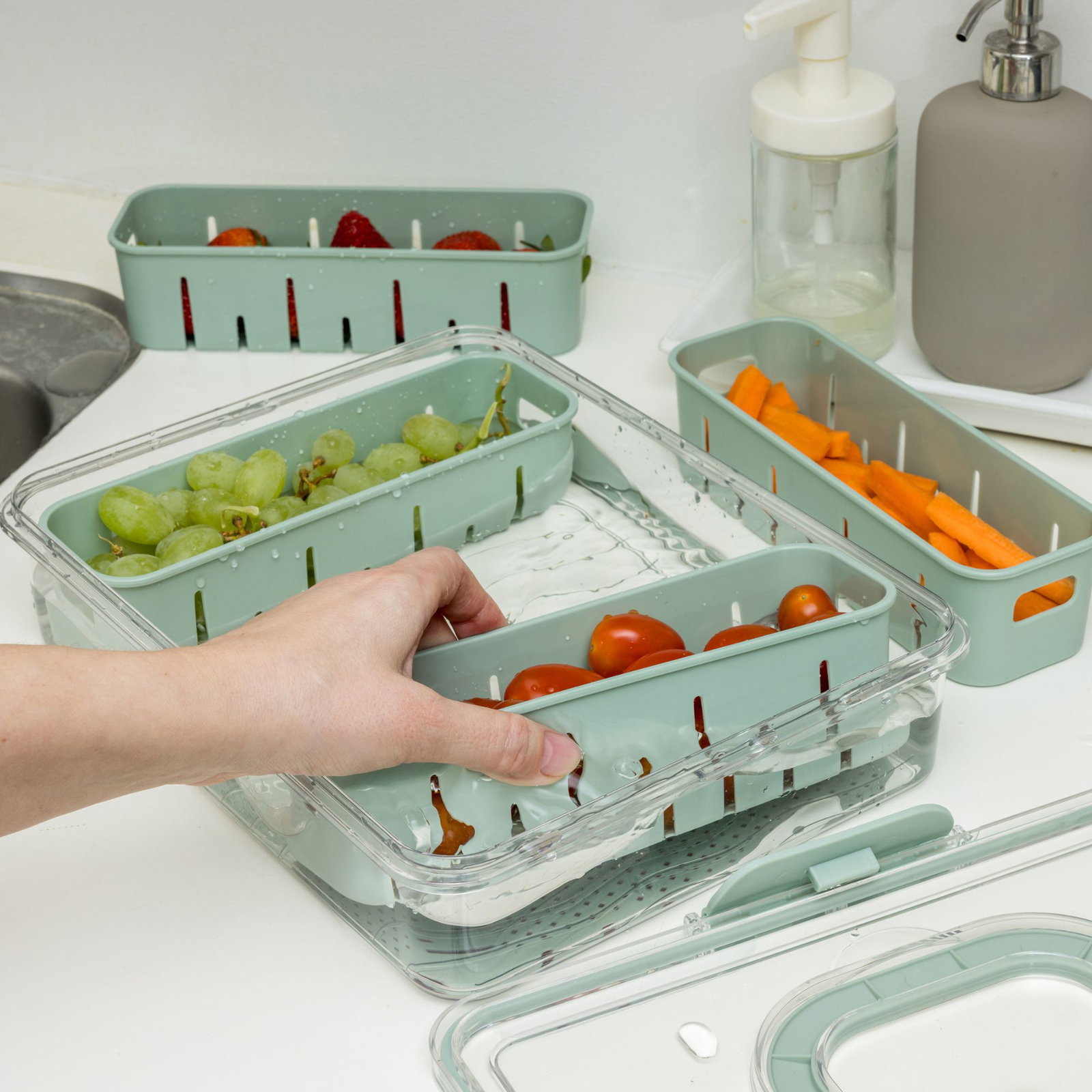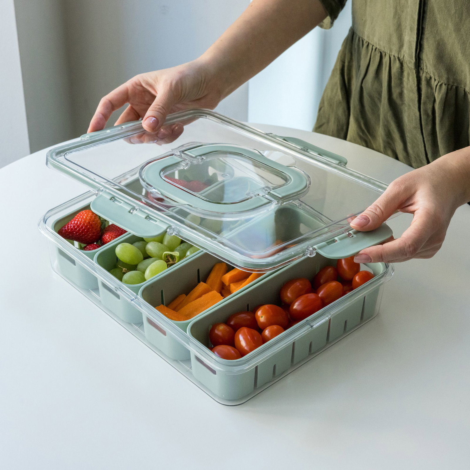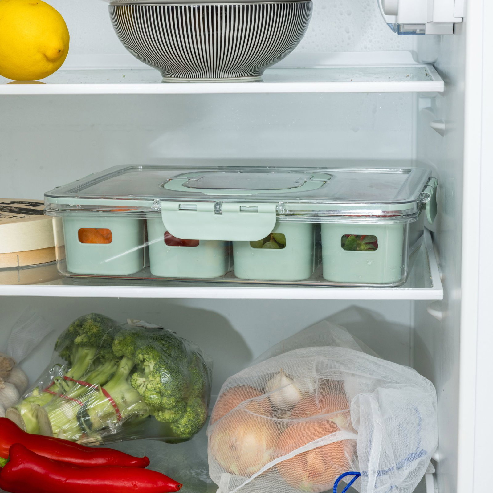 Det transparente låg gør det nemt at se indholdet med det samme, og de udtagelige bakker giver fleksibel og overskuelig opdeling. Velegnet til både opbevaring i køleskabet og til madforberedelse.