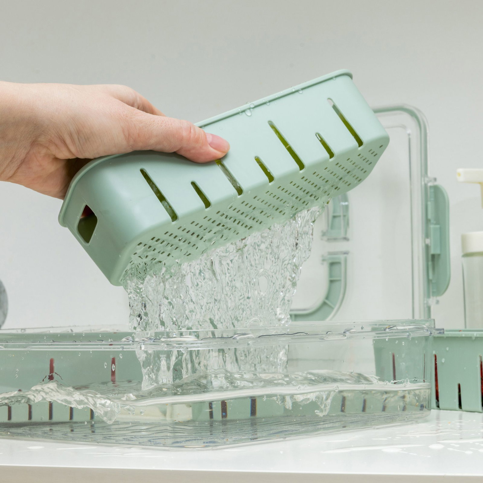 Opbevaringsboksen er udstyret med et indbygget dræn, der effektivt leder overskydende vand væk – ideel efter skylning af frugt, grøntsager og bær.