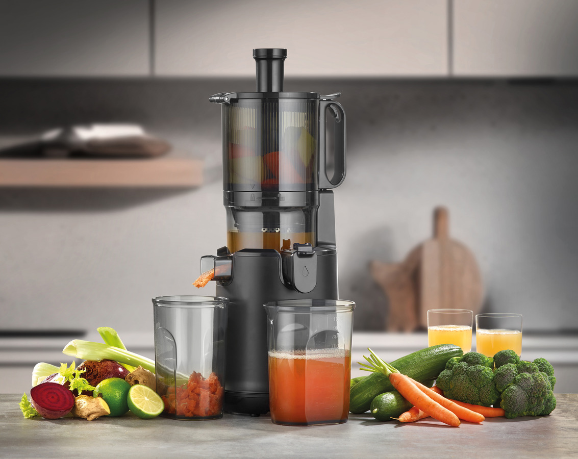 Med en langsom rotationshastighed på 40 omdrejninger pr. minut opnås op til 30 % mere juice sammenlignet med traditionelle juicere. Den rummelige Fill’n’Juice-påfyldningsåbning på 130 mm gør det muligt at anvende hele frugter uden forudgående udskæring, mens den kraftige motor på 250 W leverer effektiv og samtidig ekstra støjsvag drift.